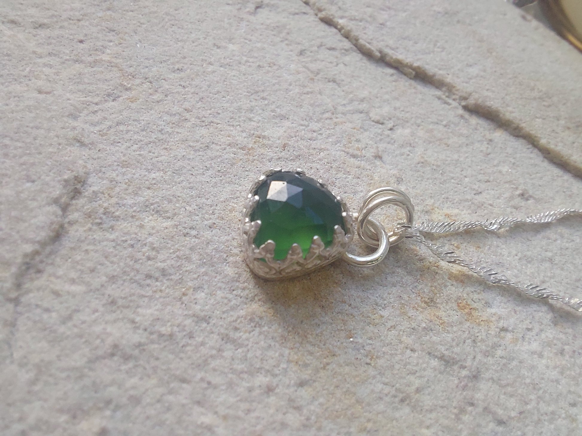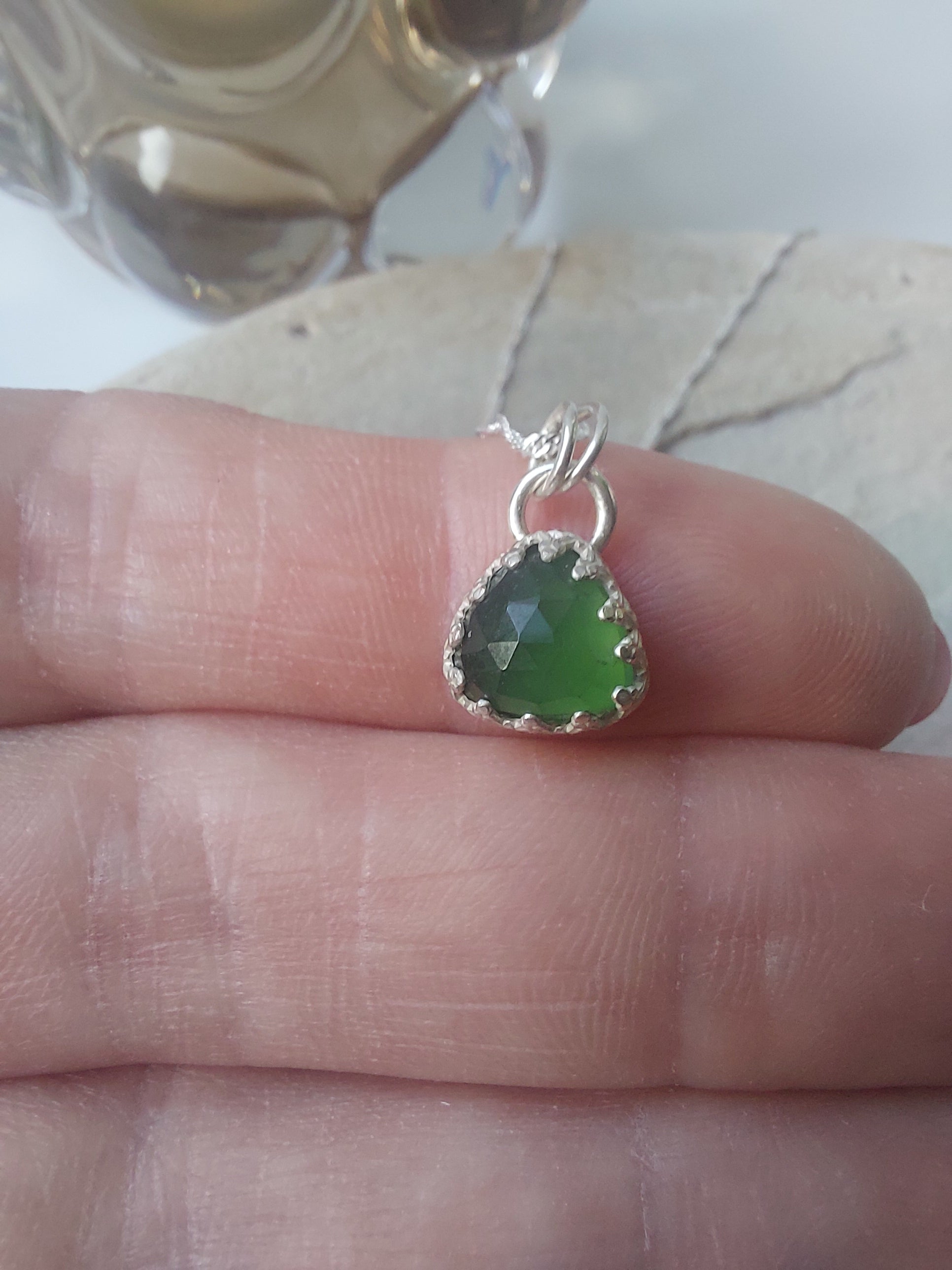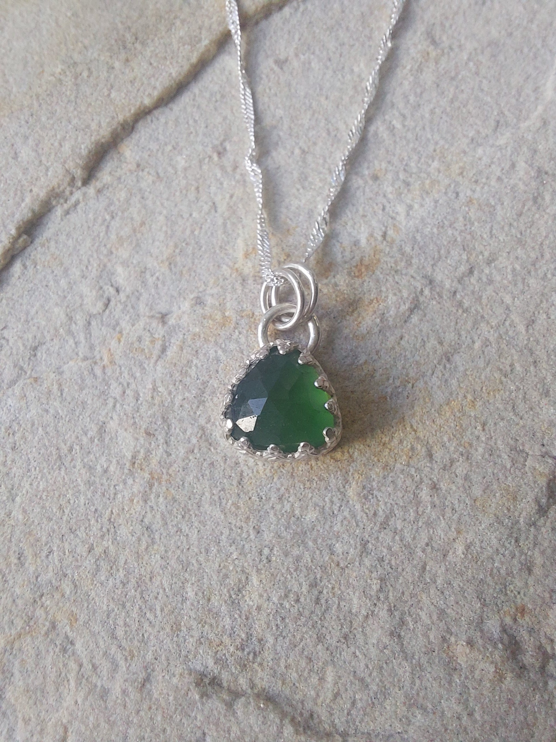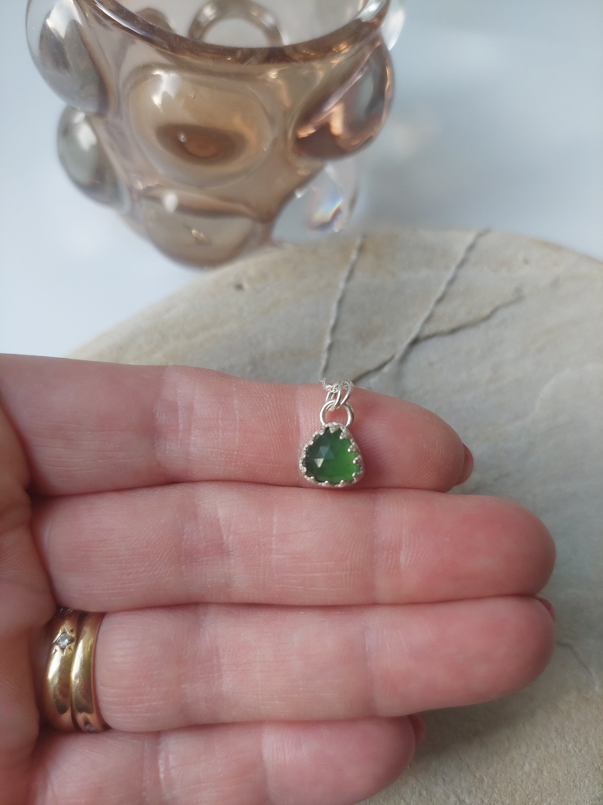 Triangular green serpentine approx 10mm x10mm in a fancy setting giving you a little edge of elegance