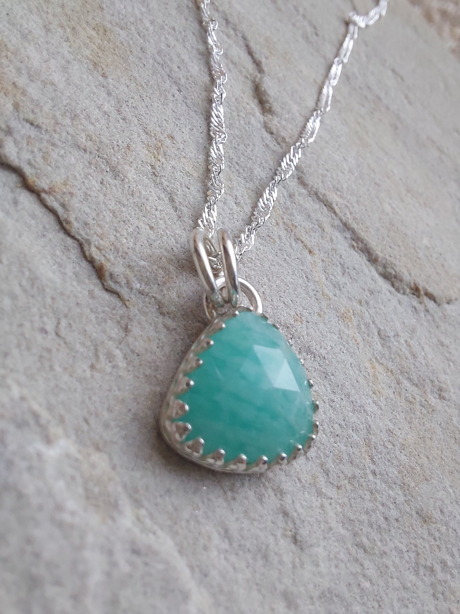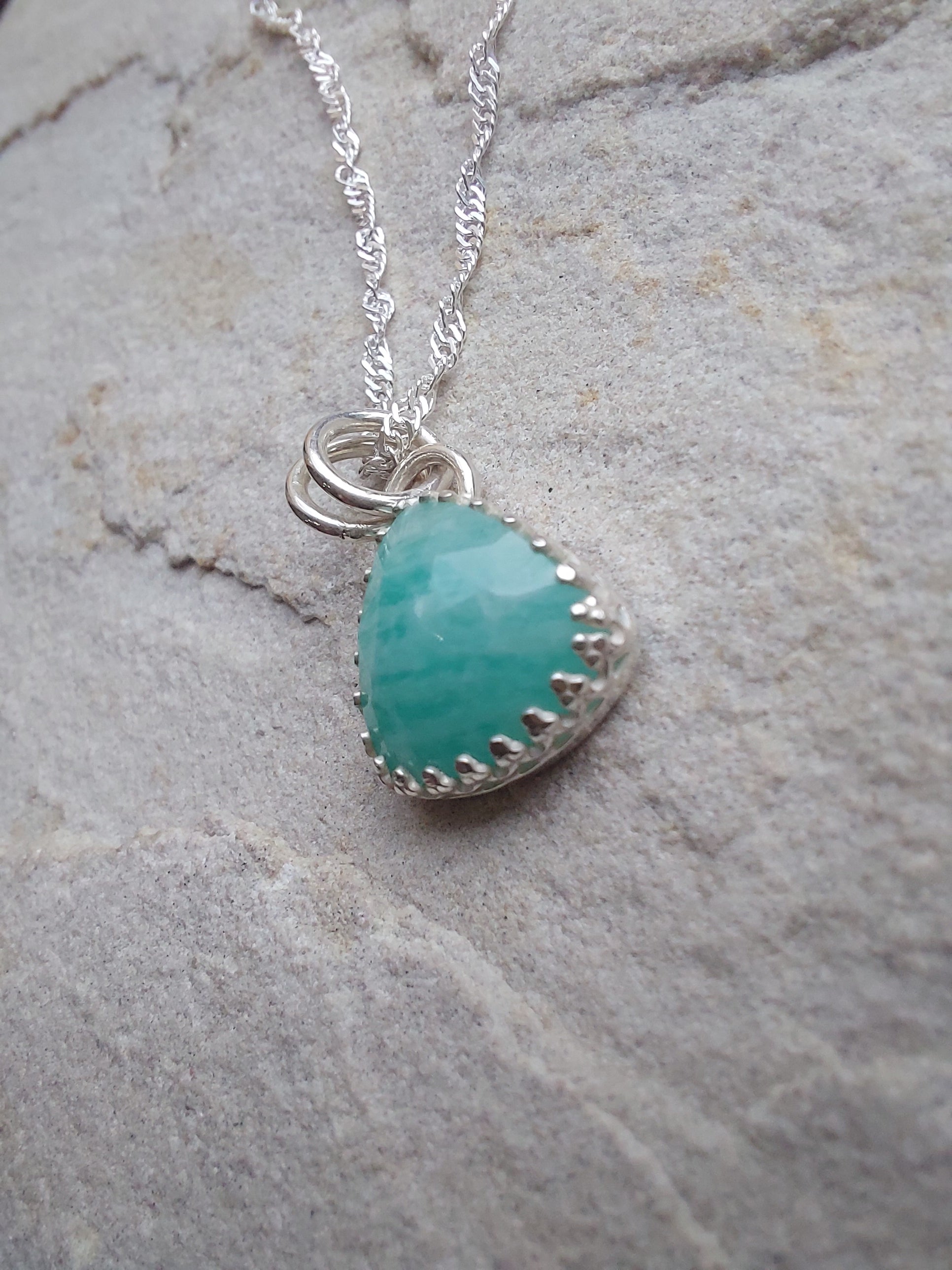 Triangular seagreen aventurine approx 10mm x 10mm in a fancy elegant setting.