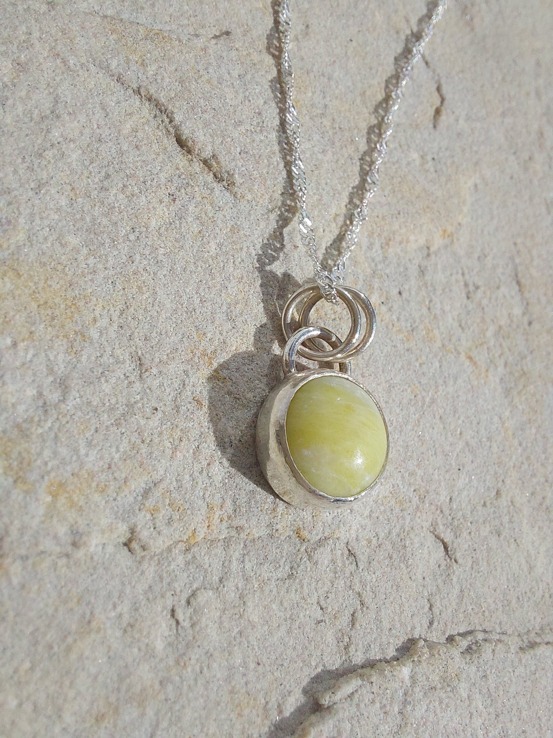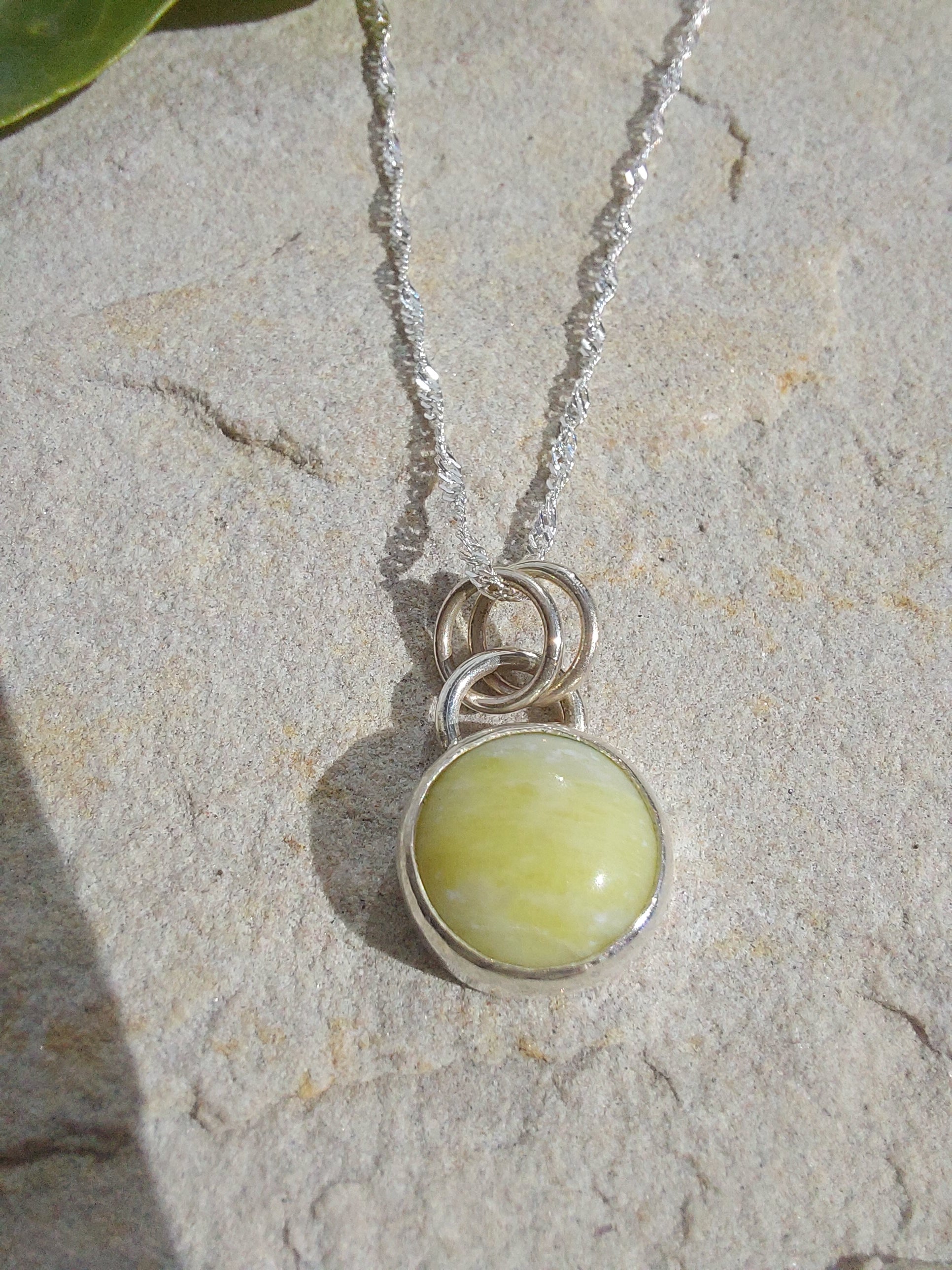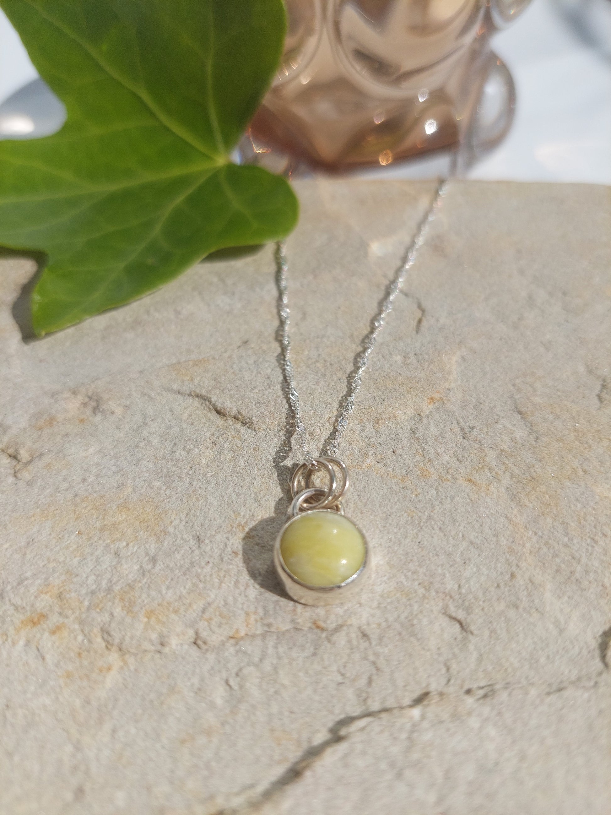 This pendant features a yellow Scottish Marble 10mm stone set in simple sterling silver. The natural warmth of the marble contrasts gently with the cool silver, creating a clean and understated look and a perfect piece of summer jewellery.