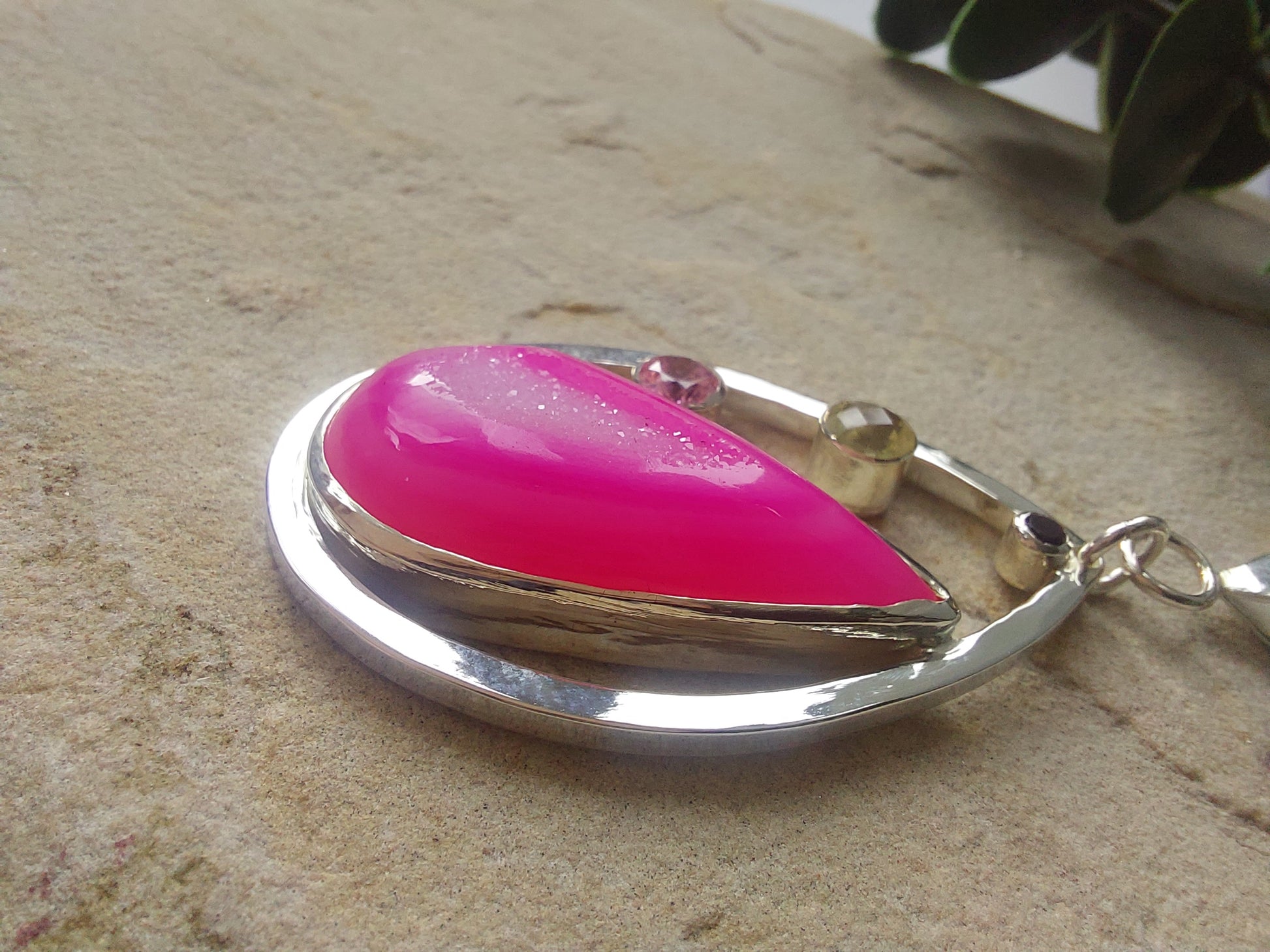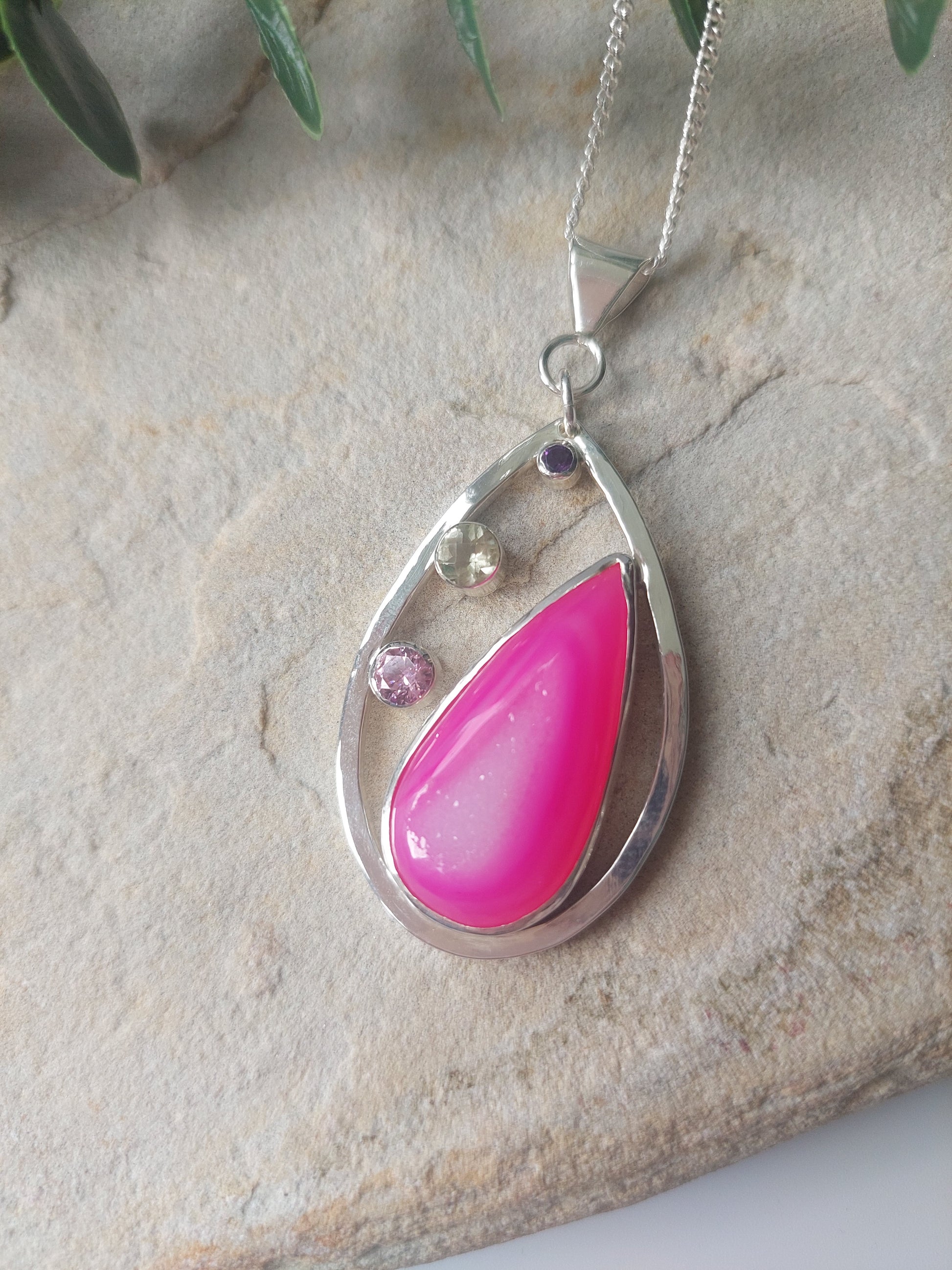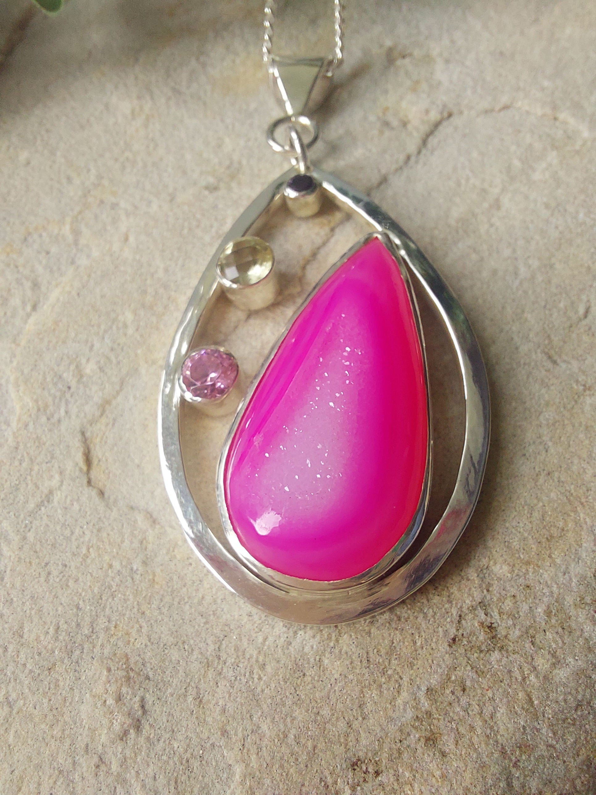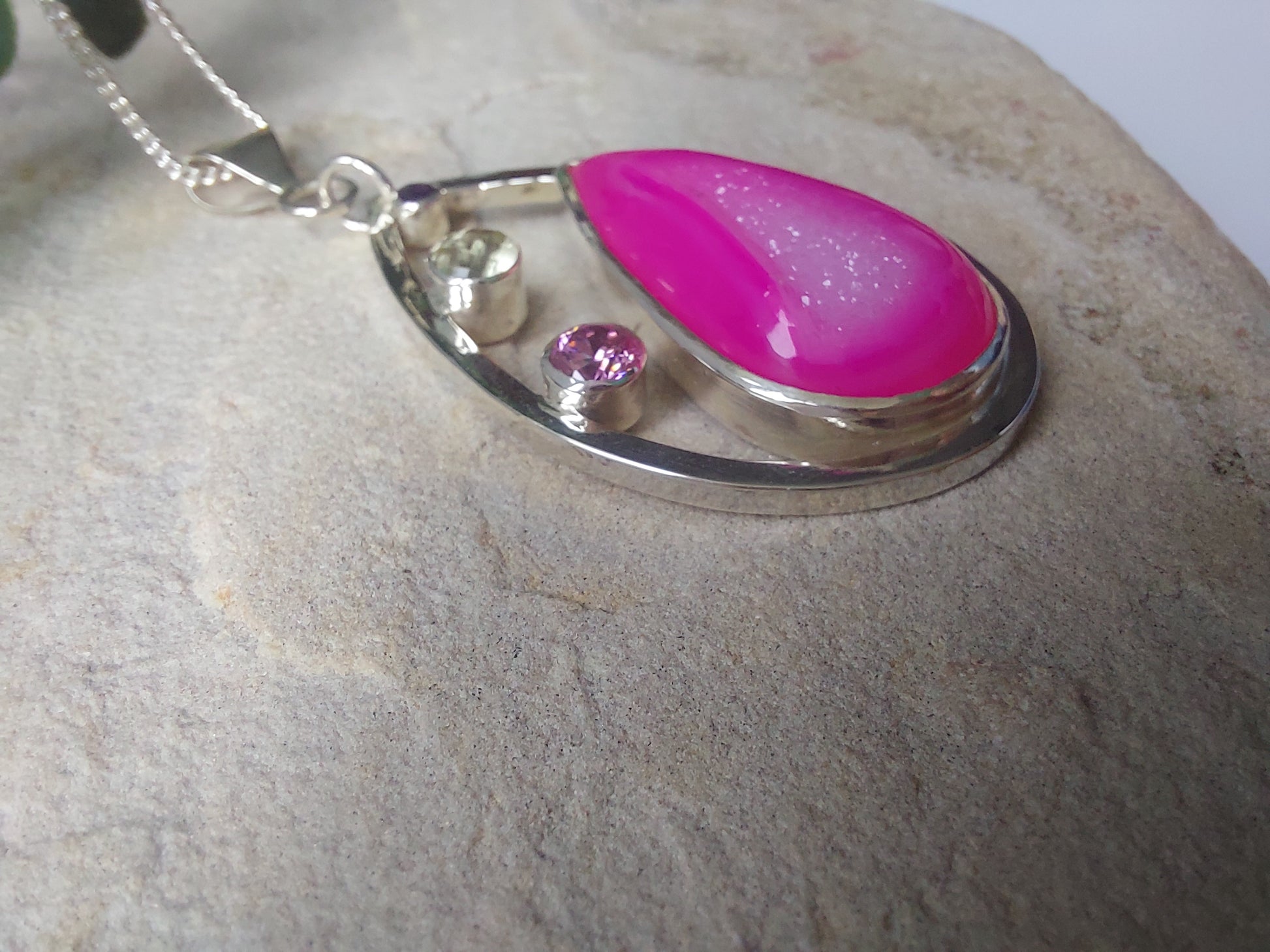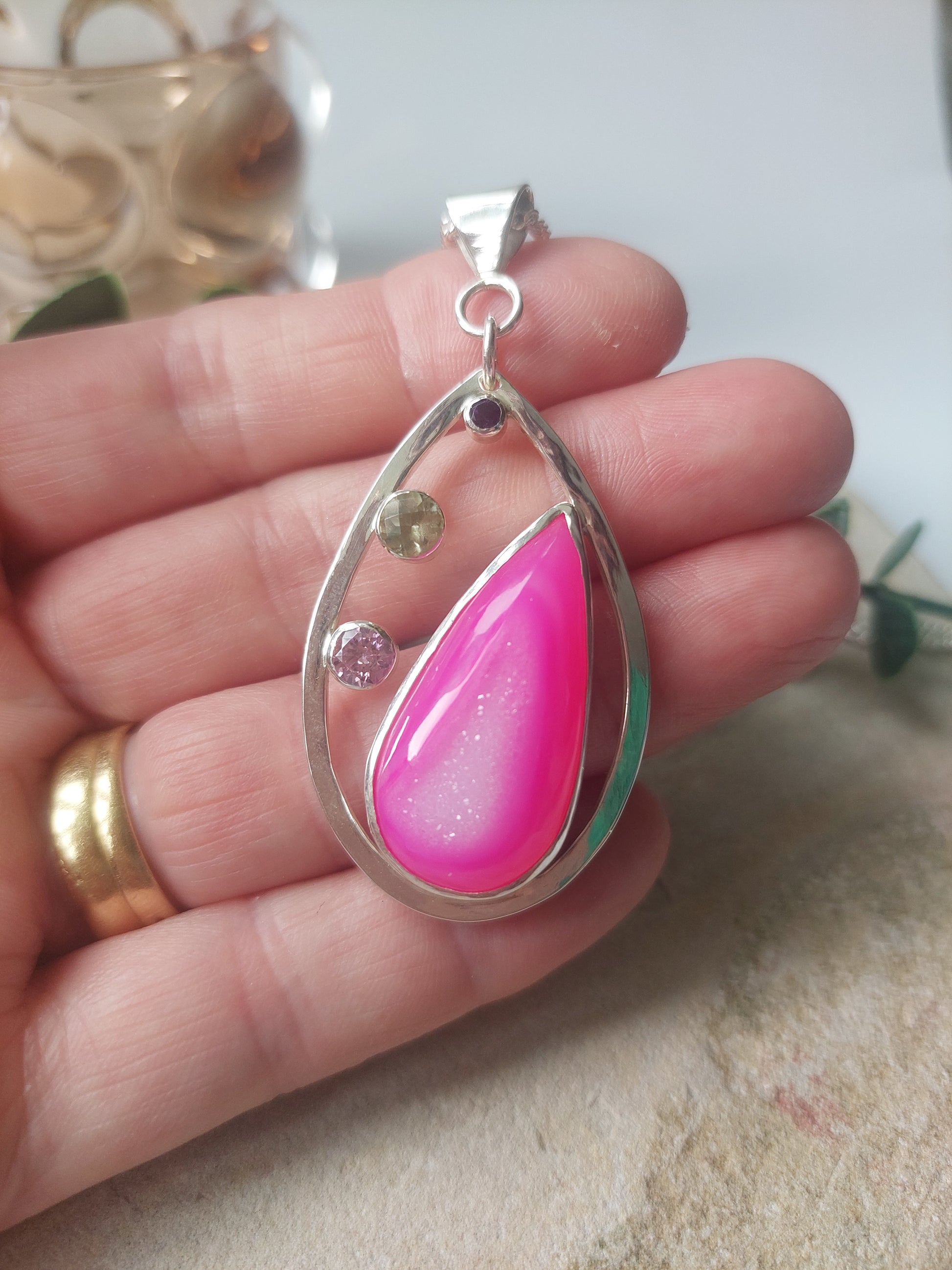 Main stone is an agate with an inclusion of druzy quartz that sparkles and catches the light as you move. This gorgeous stone is enhanced further with a 3mm amethyst, 5mm lemon quartz and a pink crystal zirconia.