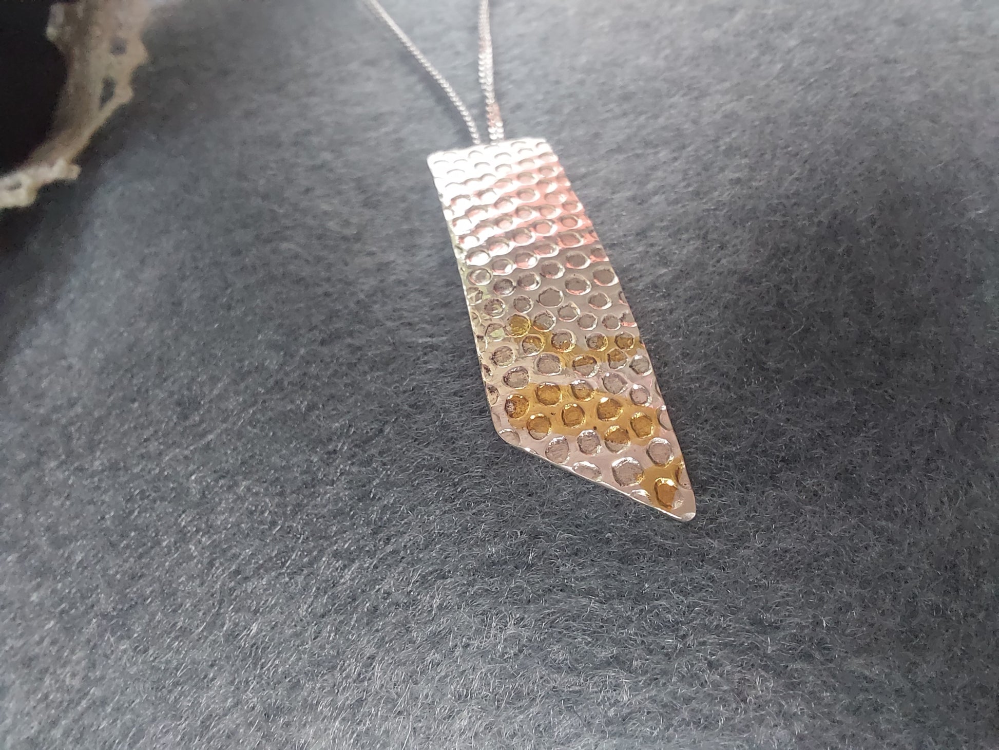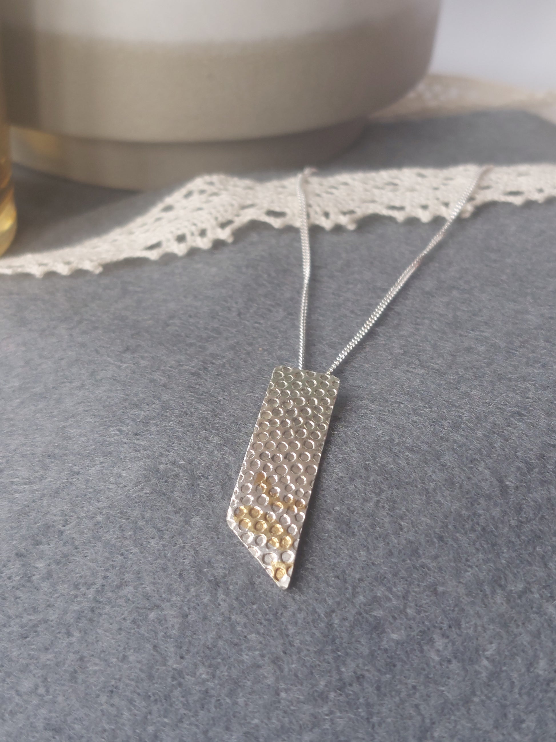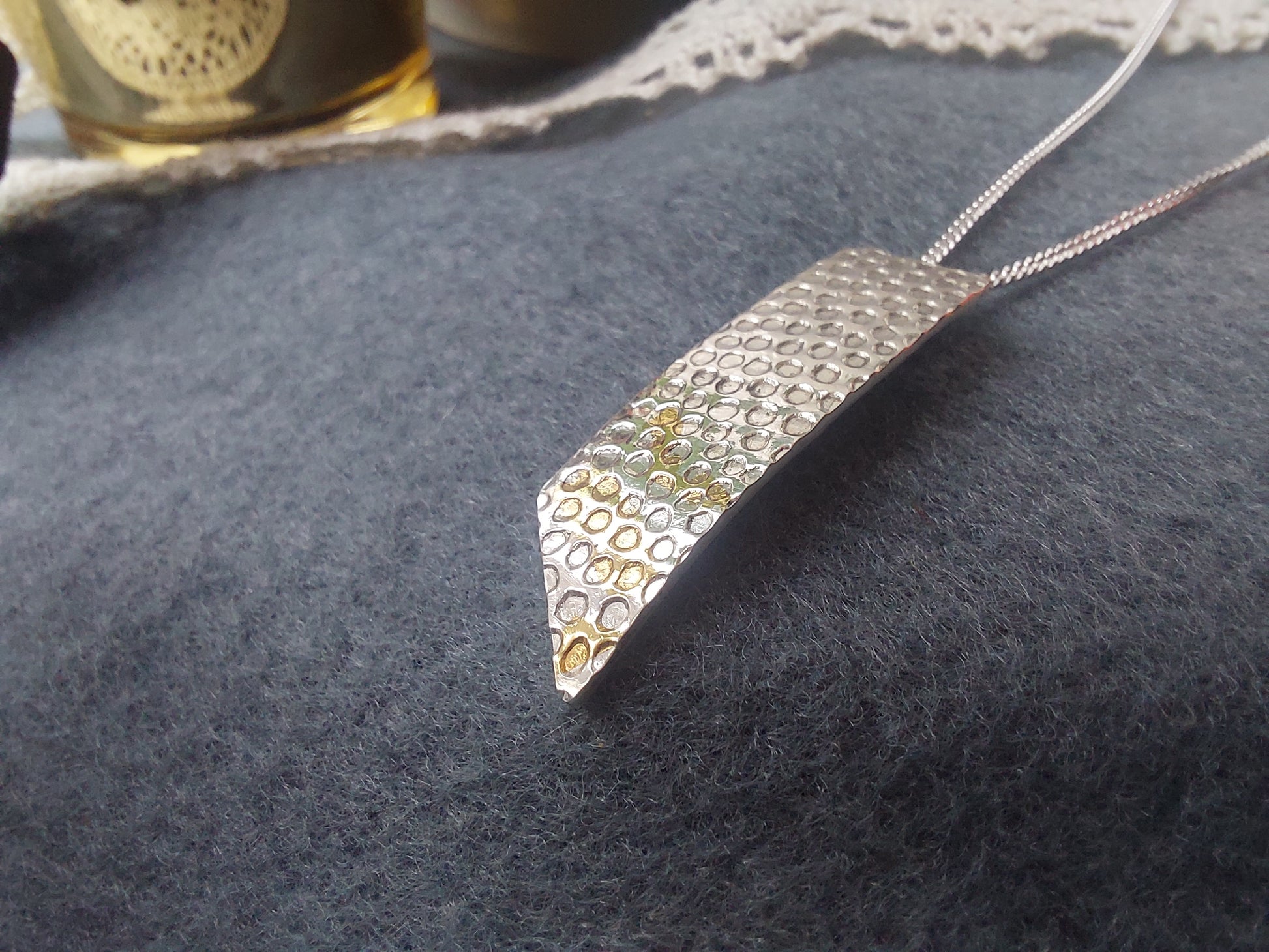 Introducing the Trish Young Jewellery Textured Fine Silver Pendant - a stunning piece of jewellery. This pendant is crafted from high-quality fine silver with accents of gold, infused using the ancient technique of keum boo.