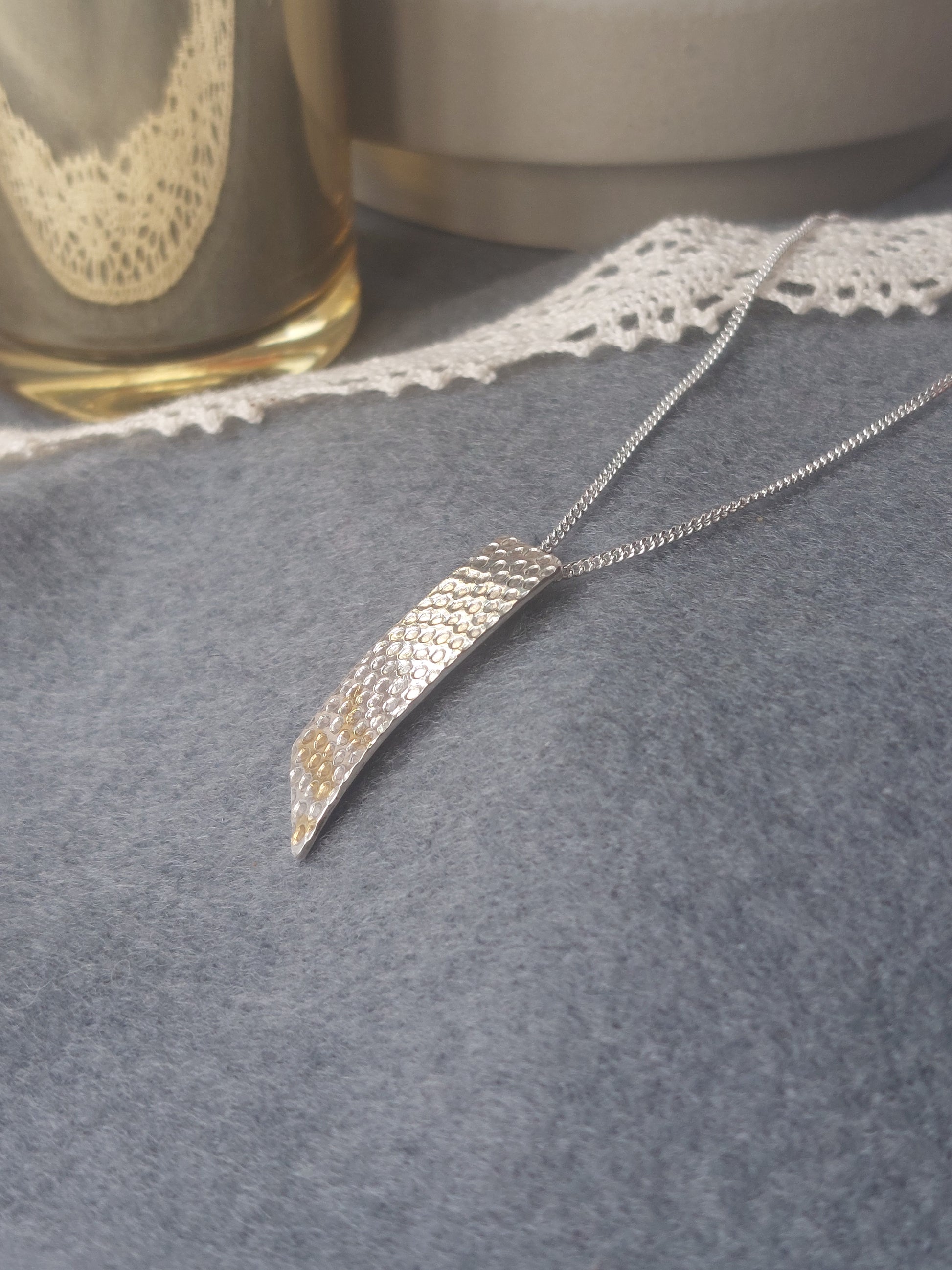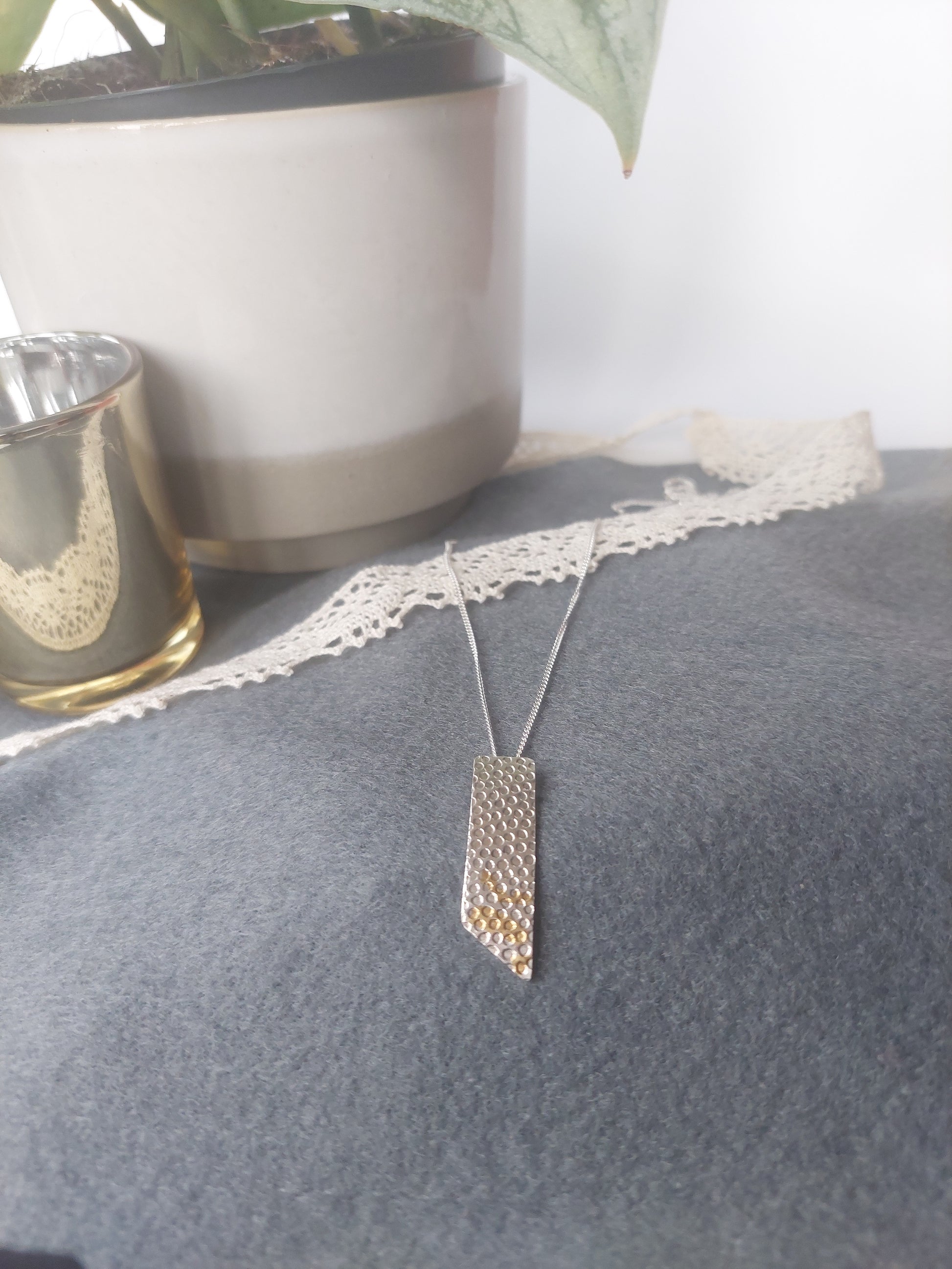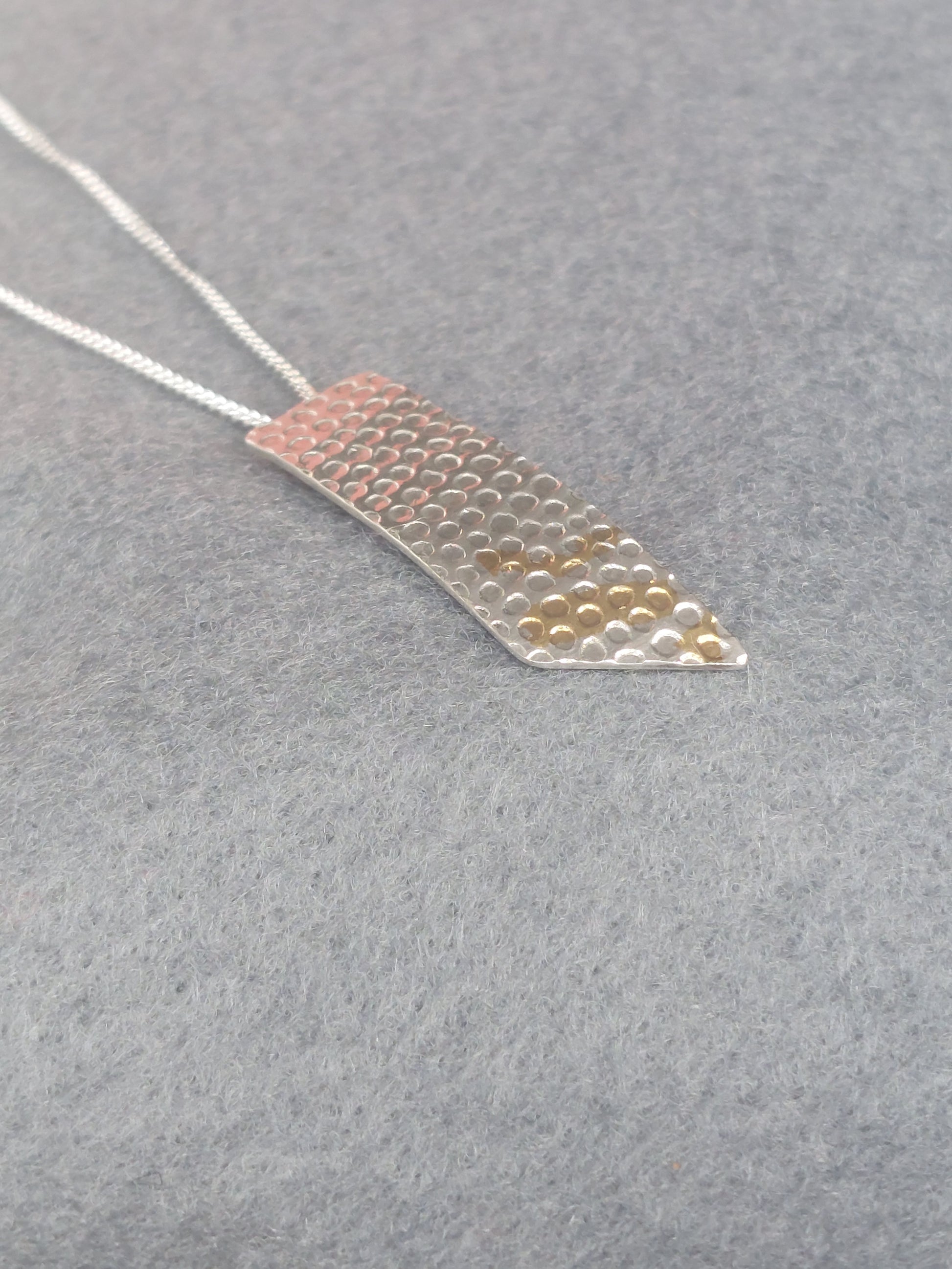 Introducing the Trish Young Jewellery Textured Fine Silver Pendant - a stunning piece of jewellery. This pendant is crafted from high-quality fine silver with accents of gold, infused using the ancient technique of keum boo.