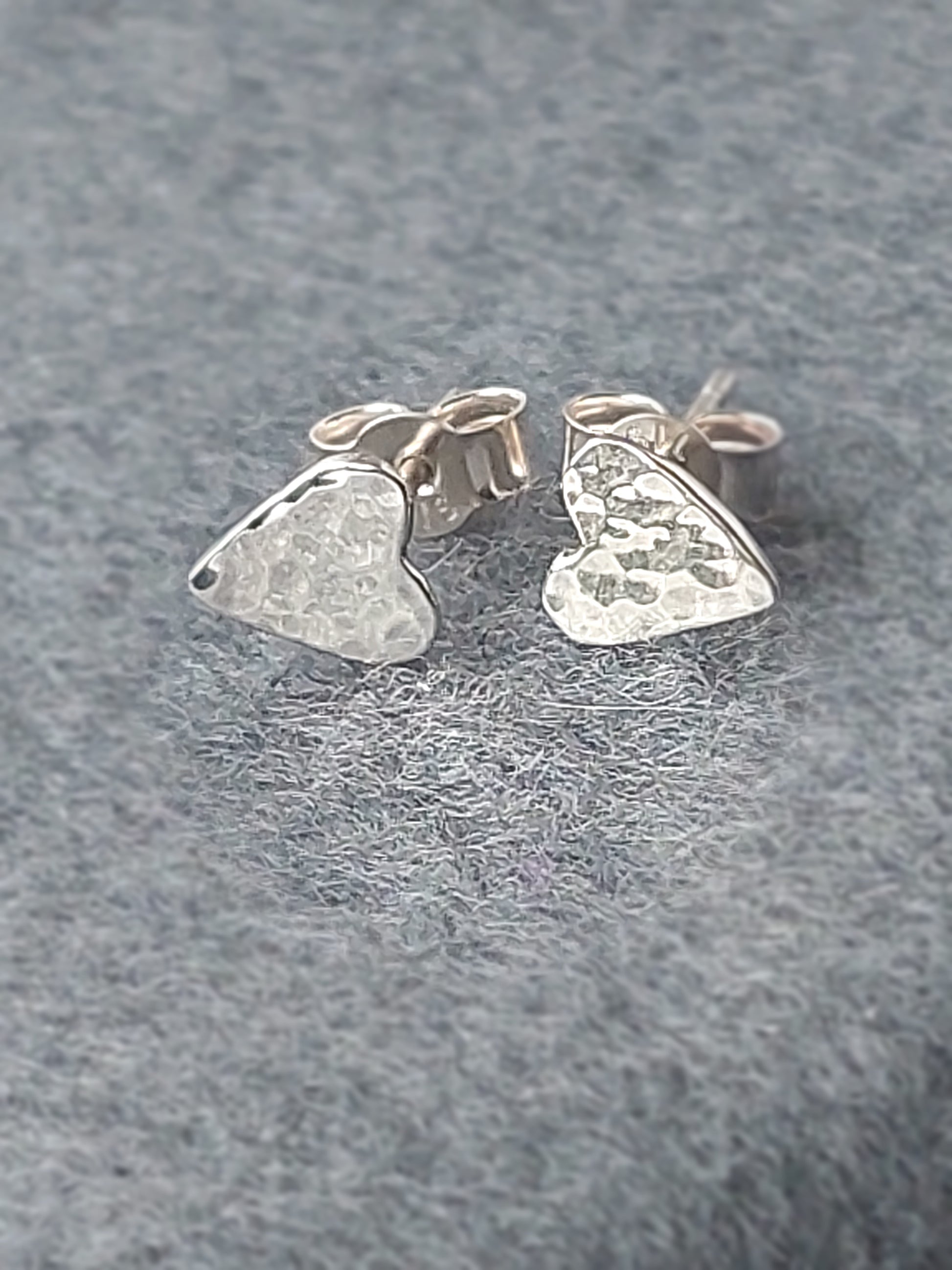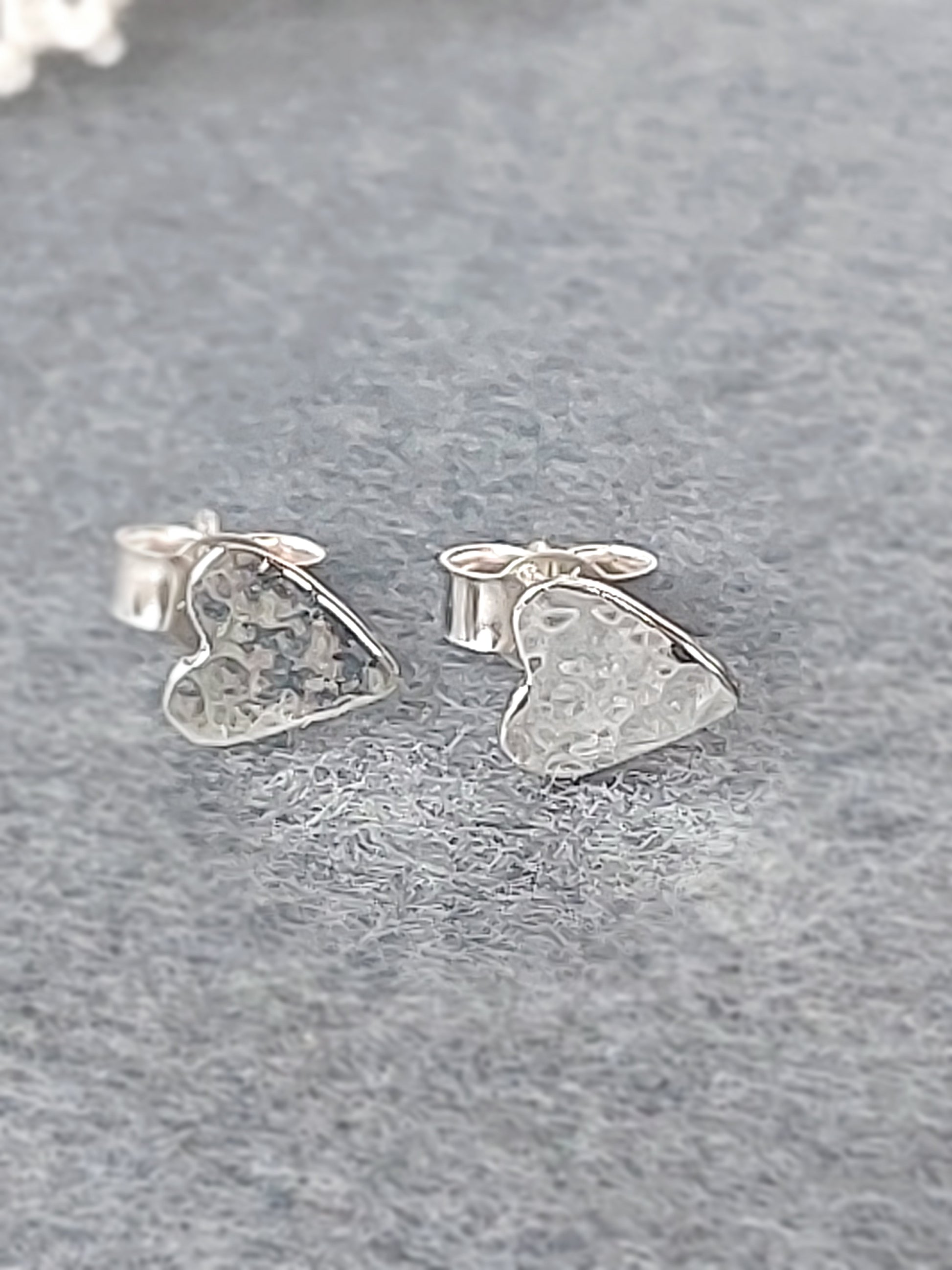 Sterling Silver Heart Stud Earrings. Delicate little everyday studs with a hammered finish that sparkles and catches the light beautifully.